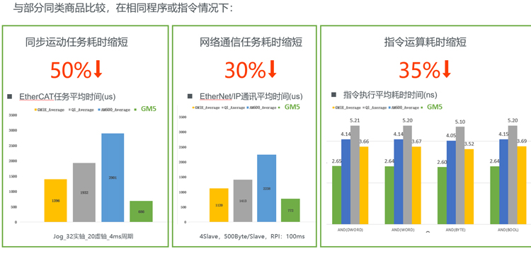 與部分同類(lèi)商品比較,在相同程序或指令情況下,同步運(yùn)動(dòng)任務(wù)耗時(shí)縮短50%,網(wǎng)絡(luò)通信任務(wù)耗時(shí)縮短30%,指令運(yùn)算耗時(shí)縮短35%。