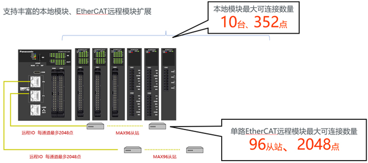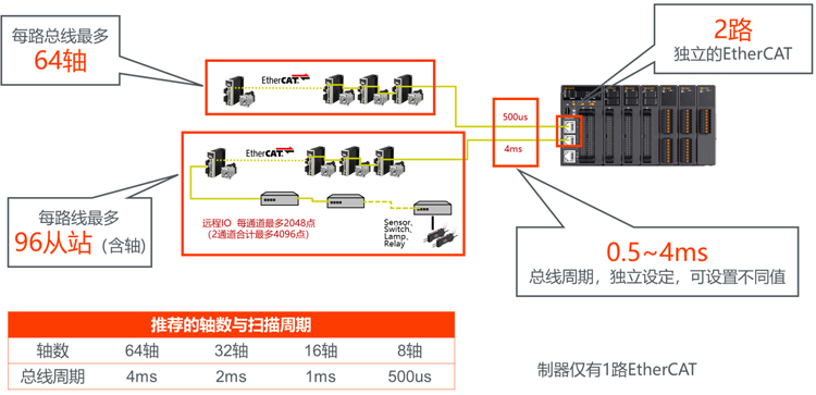 2路獨(dú)立EtherCAT總線(xiàn),最多可連接128軸網(wǎng)絡(luò)伺服。